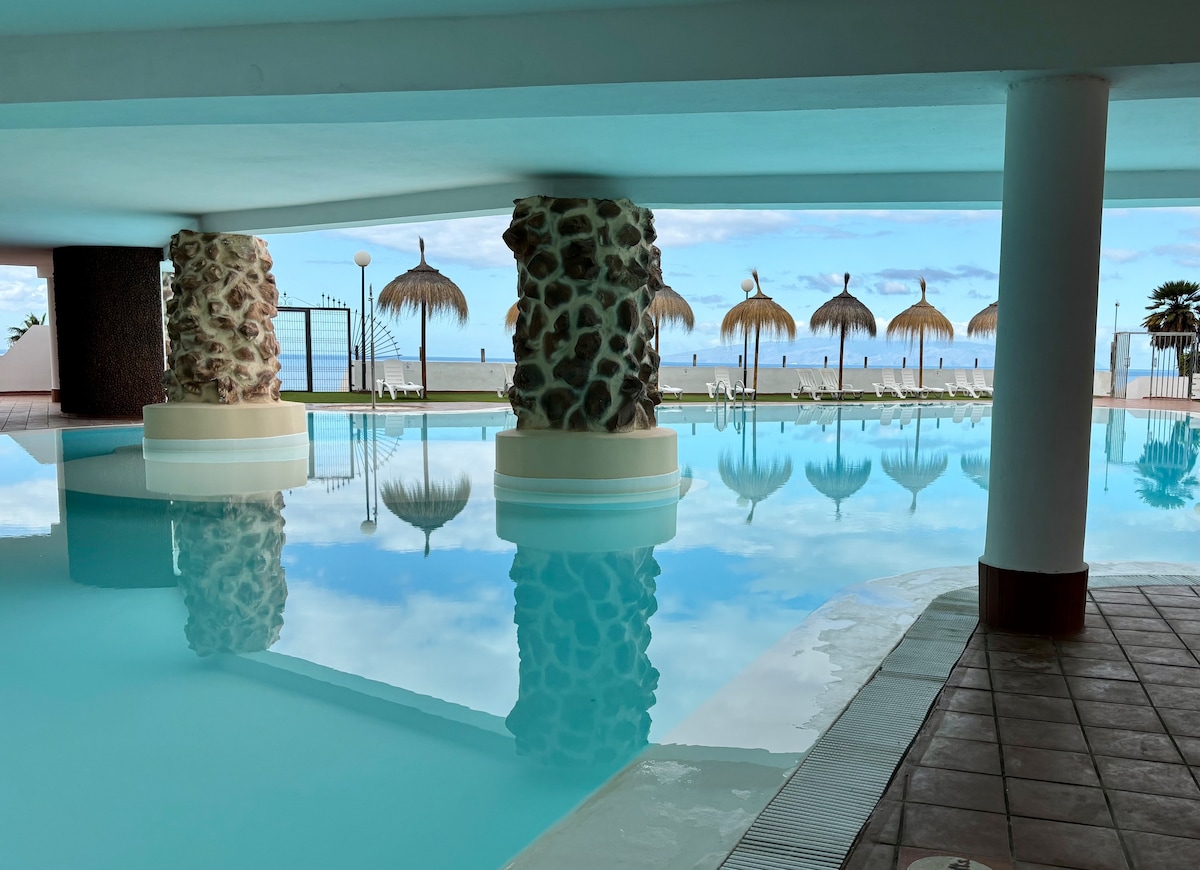 Fantastic new, private and very quiet apartment with 2 swimming pools, it is 4 minutes from the wonderful white beach of La Pinta, next to Puerto Colon, surrounded by shops, restaurants, bars, 600 meters from the Siam Park water park The apartment has a room with 2 single beds, a living room with a sofa bed for 2 people, a new and fully equipped kitchen and a bathroom with a shower, a terrace with beautiful views of the pool, ideal for families.