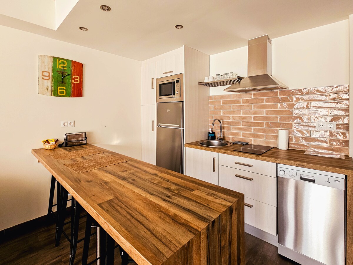 Confortable apartamento en planta baja para 2/3personas, se compone de una habitación con dos camas y TV, posibilidad de una cama supletoria para 1 persona extra (15€/ noche), baño completo, salón- cocina con sofá y TV plana de 32" con USB y HDMI, una amplia mesa junto a la cocina, equipada con electrodomésticos y amplio menaje para que disfrute de la estancia. Consulte disponibilidad de cuna gratuita.