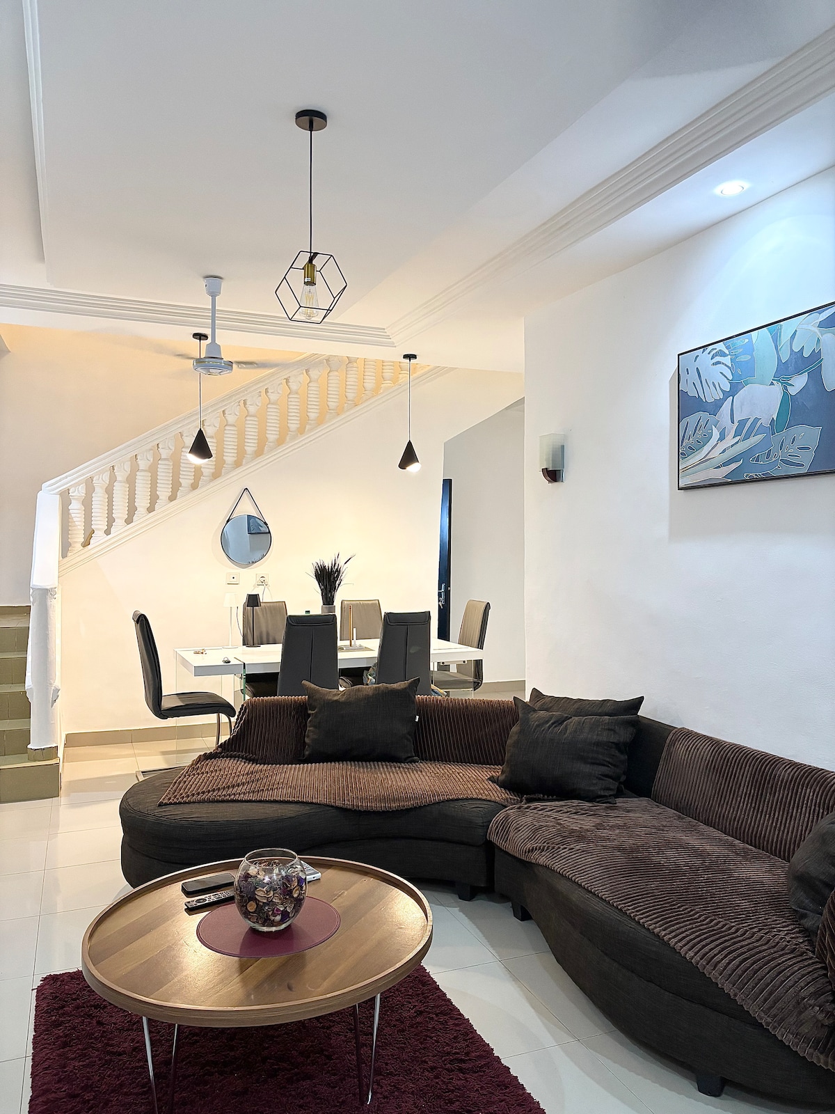 Disfruta de este elegante, cómodo y lujoso dúplex de 2 pisos con nuevos gabinetes de cocina, así como de los colchones inflados en gel de refrigeración para el alivio de la presión. Tienes todo el segundo y tercer piso y la azotea para disfrutar. Todo el segundo piso tiene una cocina de tamaño completo con todos los electrodomésticos nuevos importados, horno, cocina de gas, una gran isla y sofás hechos a mano para relajarte. El tercer piso tiene los 3 dormitorios. La azotea ofrece una vista increíble (como ninguna otra) de toda la ciudad de Cotonou.