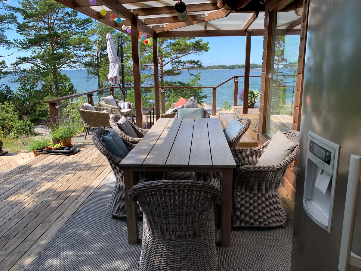 Luxury Seaside Hideaway – Sauna & Sunset Views Wake up to the sound of the sea, enjoy a wood-heated sauna and watch the sun set over the Åland Sea from your seaside terrace. This luxury villa in Eckerö sits directly on smooth granite rocks by the water, offering open sea views and unforgettable sunsets. Spend your days swimming, paddleboarding or exploring nearby coastal headlands, then cook dinner outdoors in the summer kitchen and enjoy long evenings by the sea.
