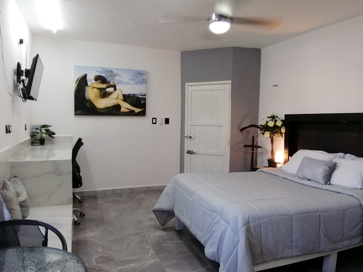 Lindo y amplio estudio con luz natural y ventilación. Muy bien equipado con todo lo necesario. Cama Queen, mesa para comer y todo lo necesario para un desayuno continental, NO COCINA. A unas cuadras del malecón y vista del mar (15 minutos caminando) Lavandería, tiendas de abarrotes, Oxxo, farmacia, iglesia y parque a una cuadra. El estudio cuenta con caja para llaves para un check-in independiente.