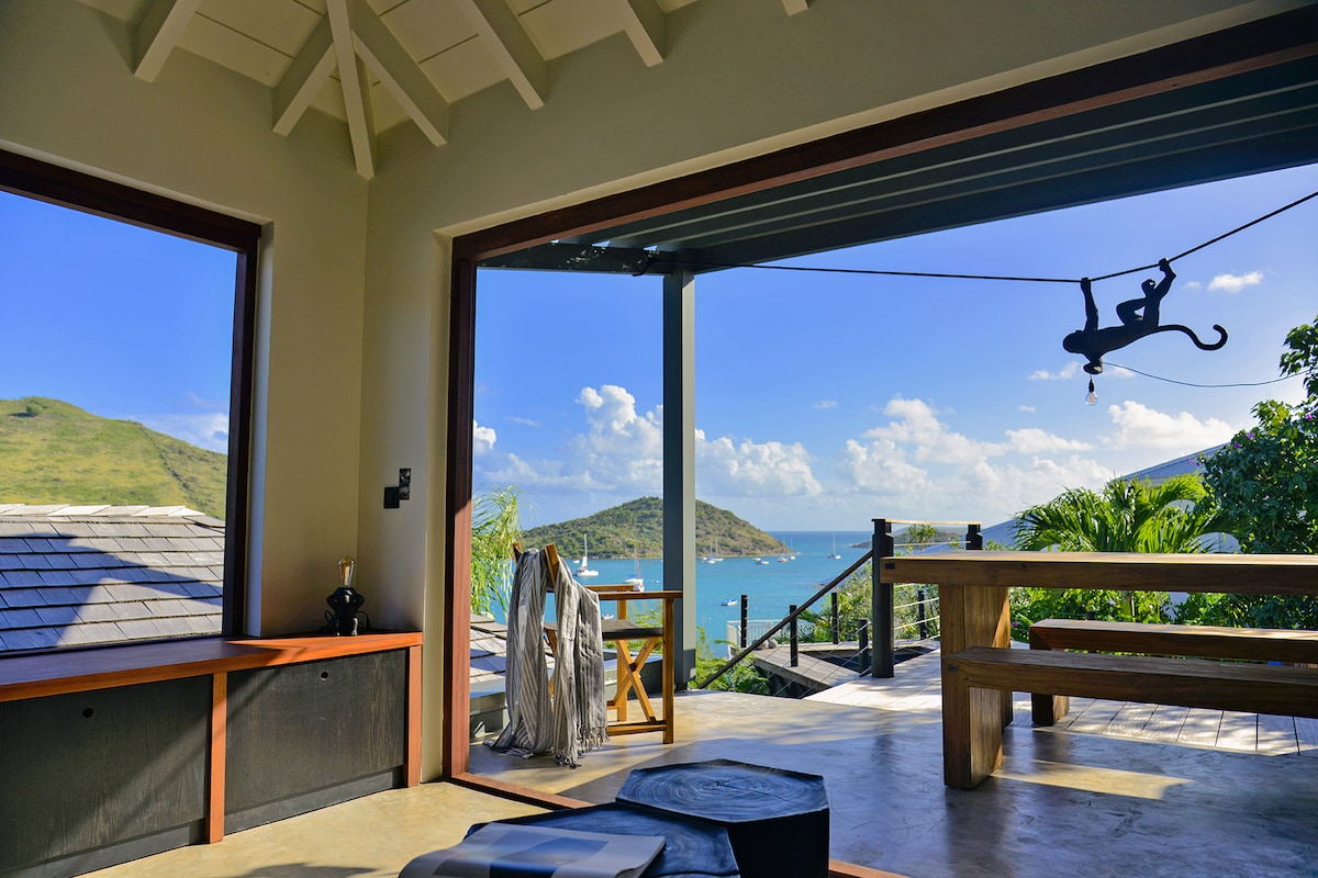 Con un aspecto único y minimalista, integrada en una exuberante vegetación, la villa OOF revela su fachada gris elefante y sus pasarelas de madera exótica para distribuir los diferentes espacios para vivir en hermosas aberturas y terrazas de madera que se sumergen en la bahía de Cul de Sac. Las vistas son mágicas. El mobiliario y la iluminación están disponibles en materiales nobles y naturales, madera, lino, hormigón... ¡Amantes del diseño y la decoración, les va a encantar esta casa!