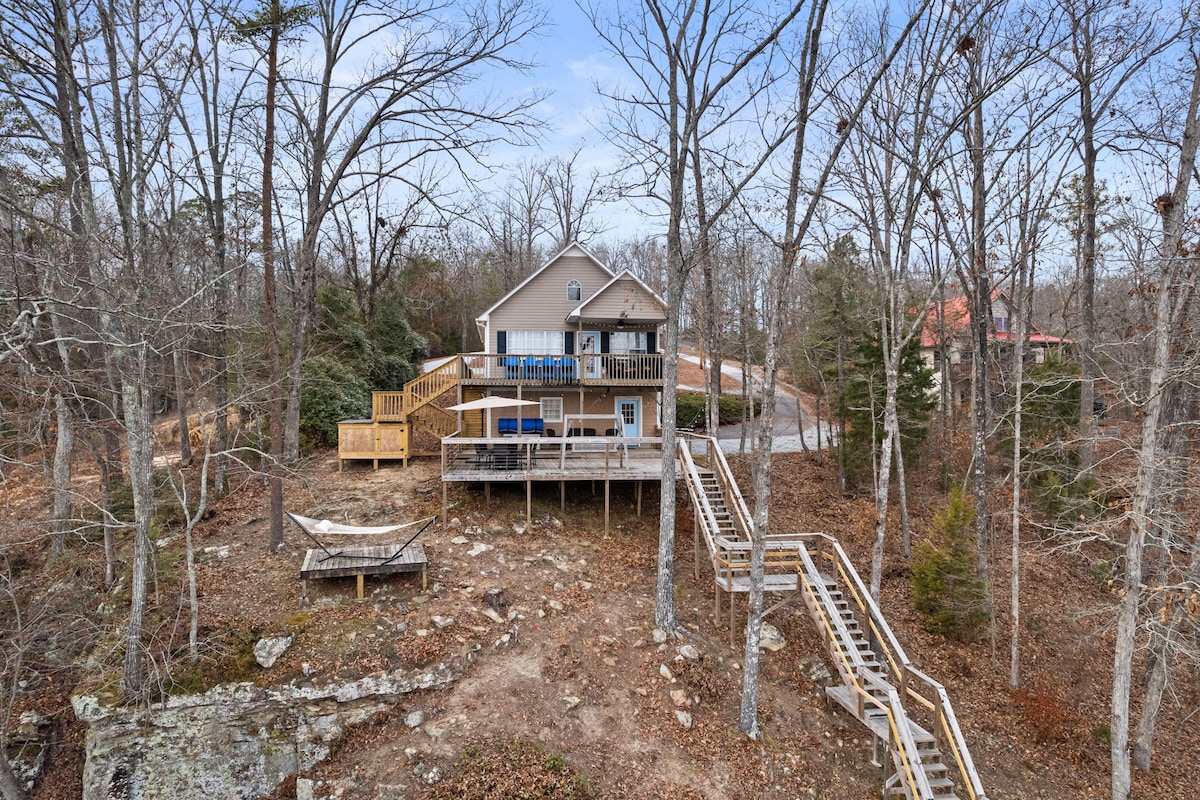 Casa de 3 dormitorios/2 baños con PRIVACIDAD y una GRAN VISTA desde dos niveles de terraza, un balcón en el dormitorio, un PORCHE CON MUCHA SOMBRA y un MUELLE escondido en una CALA con JUGUETES. La casa tiene 1470 pies cuadrados, con un porche de 500 pies cuadrados, dos cubiertas abiertas, una chimenea, una chimenea exterior y una CUBIERTA CUBIERTA para COCINAR AL AIRE LIBRE BAJO LA LLUVIA O EL SOL, con un fregadero, parrilla de carbón/LP (se proporcionan todos los combustibles).