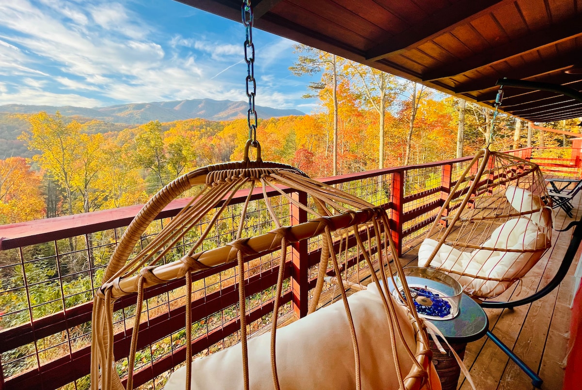 Retiro para💖 parejas/familias 💗 Vistas a la montaña en las⛰️ 4 estaciones 🏡 Cabaña de madera + balcón Sauna de🛀 infrarrojos Fogata y columpio al aire🔥 libre Propiedad 🌳 privada de 6 acres Wi-Fi de🛜 alta velocidad A 🚗 2 min (0,3 millas) en auto de Rocky Top Sports World. 🛌 Cama de matrimonio, cama de matrimonio, sofá cama y cuna Futbolín 🕹️ Arcade 65" Smart TV Vistas estacionales de la vida🐾 silvestre: oso, halcón, ciervo, zorro, luciérnaga, etc. 🎨 El distrito de Artes y Oficios y Greenbrier NPS están a menos de 5 minutos 🎡 Pigeon Forge está a 20 minutos en coche por una ruta panorámica. 🍷Parrilla de carbón.