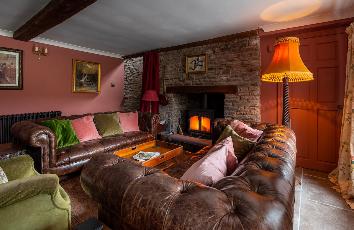 Acogedora suite dúplex recientemente renovada con entrada privada en la parte trasera de una casa histórica con sala de estar, dormitorio arriba, aseo y cuarto de ducha. SIN COCINA pero hay nevera, microondas, tostadora, hervidor de agua y cafetera Nespresso. En 20 acres de terreno con unas vistas impresionantes. Crickhowell High Street está a 10 minutos a pie. Acceso directo a senderos al río Usk desde la propiedad y paseos de montaña a Table Mountain y más allá al otro lado de la carretera. Aparcamiento seguro y almacenamiento de bicicletas.