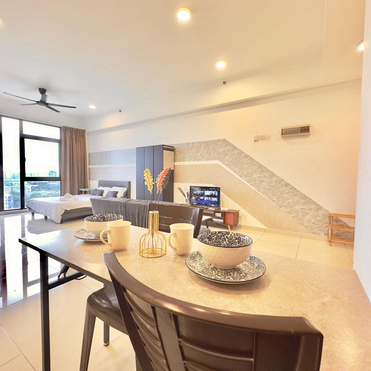 Explora nuestro acogedor estudio, que puede alojar de 2 a 3 personas con una cama tamaño queen y un sofá cama. A solo 15 minutos en coche de KLIA T1/T2, el lugar está rodeado de muchos restaurantes, sucursales de comida rápida, tiendas de comestibles y lavanderías, todo a poca distancia a pie. Disfruta de todas las comodidades, incluido el parque infantil, la zona de barbacoa, el gimnasio y la piscina, con seguridad las 24 horas, 7 días a la semana. * No disponible para dejar el equipaje antes de las horas de llegada. Debido al diseño del edificio, es necesario subir 10 escalones para llegar al ascensor.