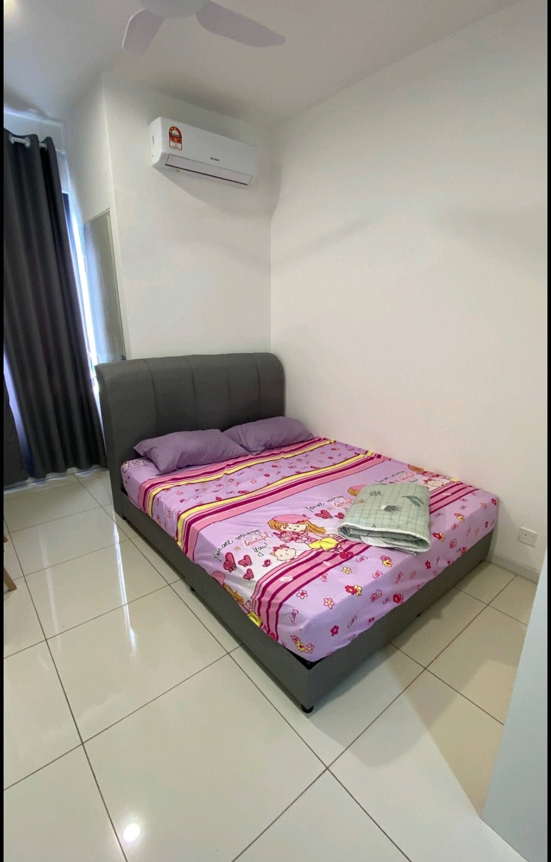 Modernas y elegantes suites de decoración. Ofrecemos un dormitorio principal y una unidad entera con 1 cama tamaño queen, 2 cunas para niños pequeños, sala de estar con sofá cómodo, TV android, mesa de comedor, cocina americana y estacionamiento gratuito. Nuestras suites ejecutivas cuentan con instalaciones de 5 estrellas (piscina, gimnasio y parque infantil), aire acondicionado, wifi, calentador de agua, microondas, sandwichera, nevera, té de café de cortesía, aparcamiento gratuito y seguridad las 24 horas. ¡Cerca de KLIA y Kuala Lumpur a solo 20-30 minutos en coche (durante las horas no pico)!