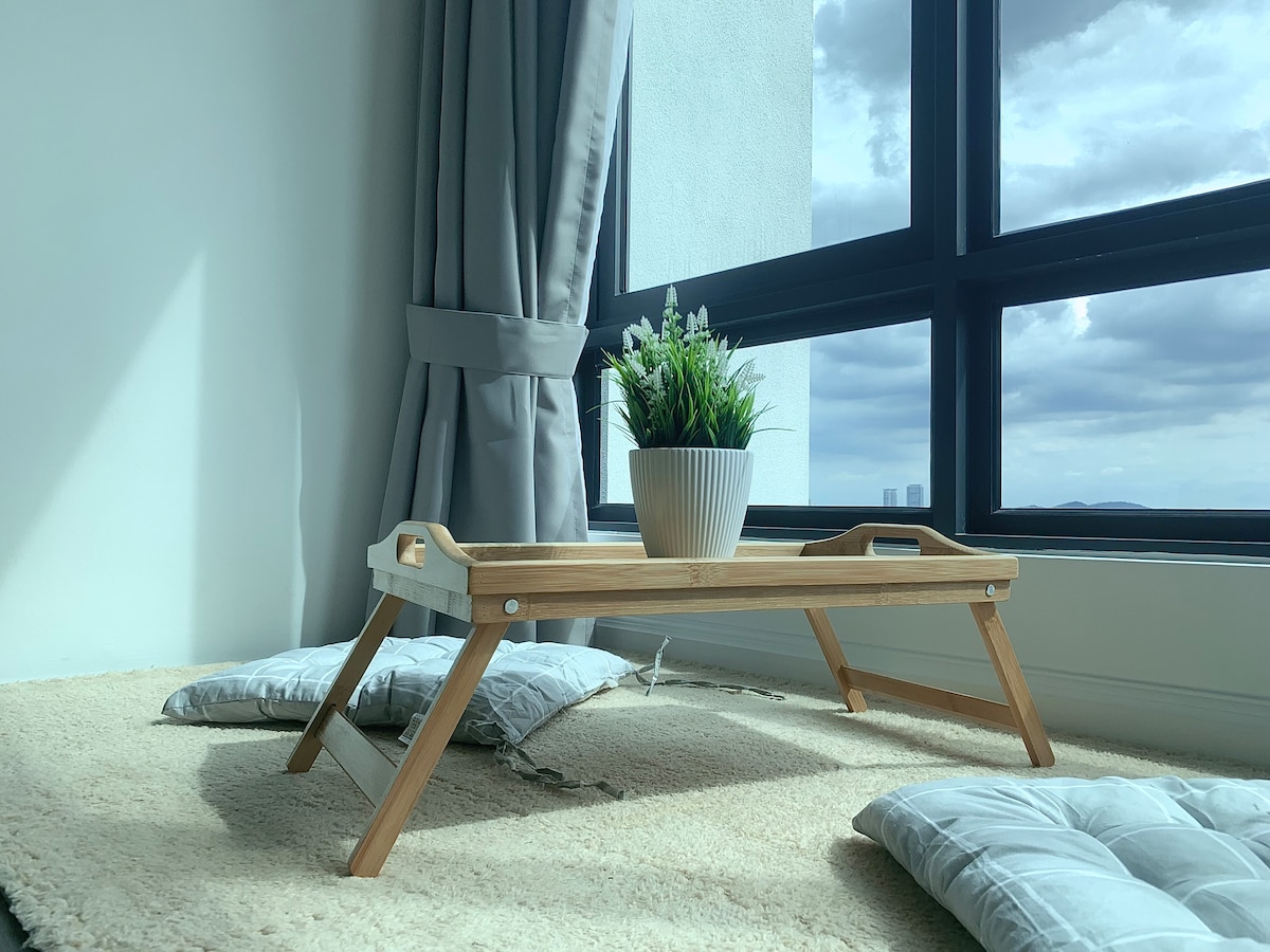 Apartamento de 2 dormitorios equipado con 3 aires acondicionados, internet de alta velocidad y el más reciente es un purificador de agua ideal para alojar a 4 personas. Sereno entorno en planta alta, completo con piscina y gimnasio. Ubicado cerca del aeropuerto KLIA, Malasia. Disfruta de una estancia sin estrés con llegada autónoma las 24 horas, convenientemente ubicado a solo 15 minutos del aeropuerto internacional T1 o T2. Tanto si tienes una salida temprano por la mañana como si llegas tarde, ahorra tiempo y relájate antes de tu vuelo. Grab está disponible las 24 horas.