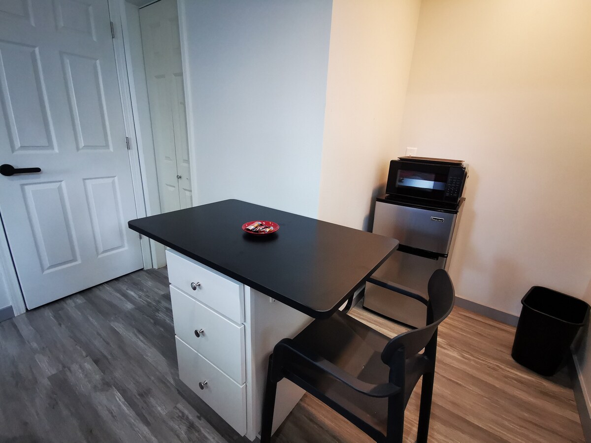 Enter through a private entrance to this basement studio apartment. Newly constructed in 2018, the space is well lit, insulated, and in a quiet neighborhood. Enjoy a full bathroom with laundry, and a kitchenette: 4.5 cu.ft. refrigerator, microwave, extra large toaster oven, hot plate, crock pot, pots, pans, dishes, keurig coffee machine, and full kitchen sink. 1 queen bed accommodates up to two guests. Guests must have at least 3 positive stay reviews to book our space.