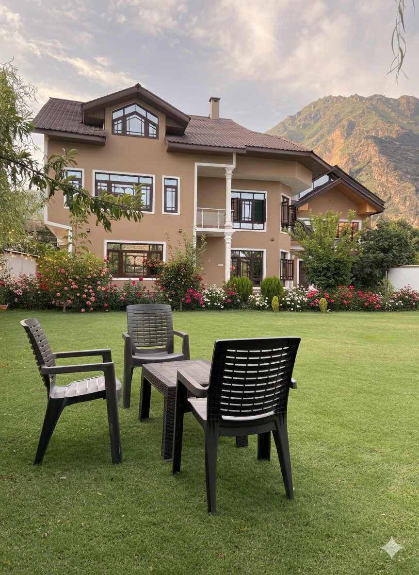 Wake up to beautiful views of the Gulmarg mountain range from this serene cottage set on over an acre of private, walled land. Surrounded by a terraced garden filled with local fruit trees and flowers, it offers a calm, healthy retreat away from the city. Enjoy table tennis, a gym room, ample free parking, and easy access to public transport. Perfectly located for Gulmarg, Sonmarg, and Pahalgam, just 35 minutes from Lal Chowk, with a fully equipped kitchen or convenient home delivered meals.