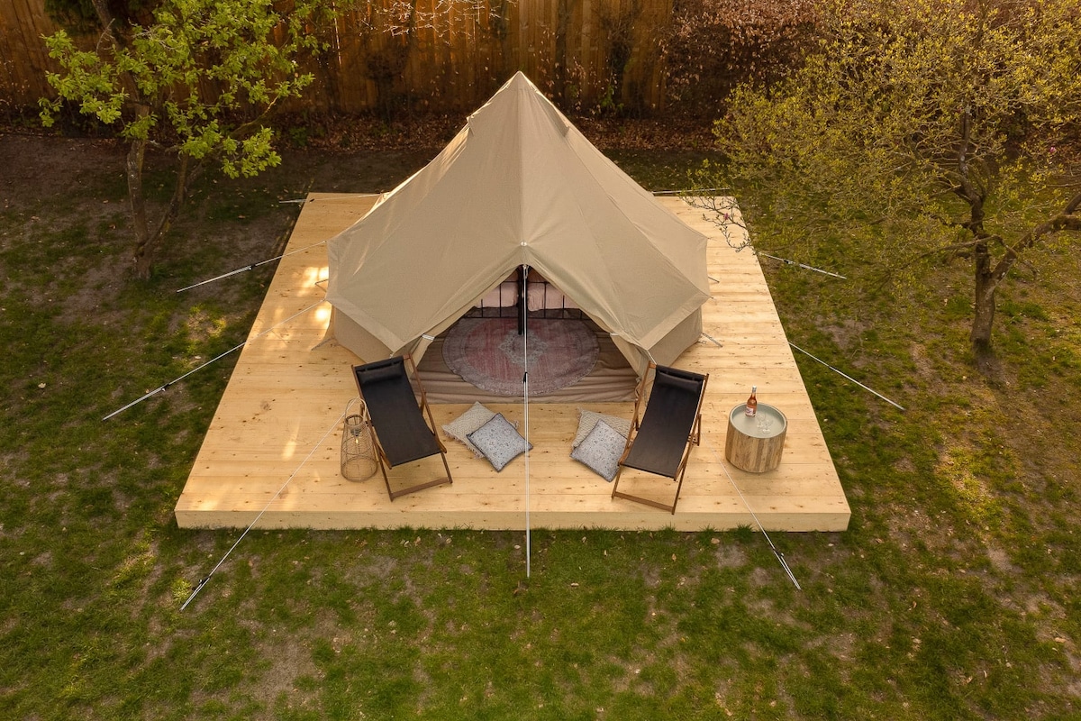 Experience real glamping, with nature right outside and alpacas grazing close by. The tent is about 36 m² and accommodates up to 7 people (4 adults and 3 children, or 2 adults and 5 children), making it ideal for both families and friends. It features a separate bedroom, a pellet stove that keeps the tent warm on chilly evenings, and a bathroom with shower and toilet. Outside is a veranda and an outdoor kitchen with gas grill, refrigerator, and seating for shared moments together.