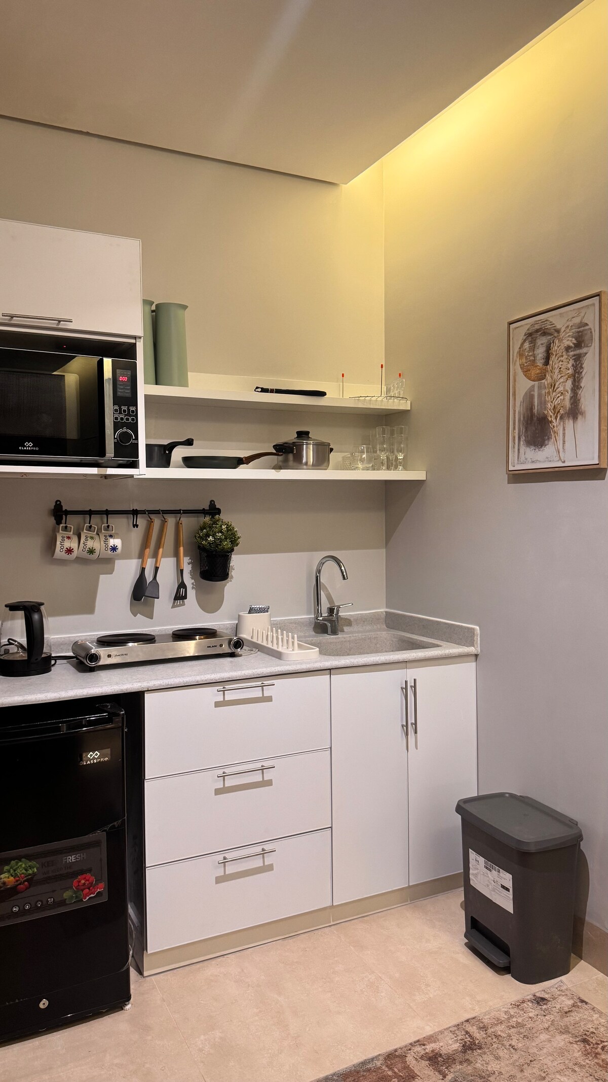 استمتع بإقامة فندقية أنيقة تجمع بين الراحة والفخامة بنظام دخول ذاتي، وبتصميم عصري وألوان هادئة تعكس الرفاهية. تضم الشقة صالة واسعة بأثاث مريح وتلفزيون ذكي ومطبخ متكامل يحتوي على جميع المستلزمات الأساسية. غرفة النوم تتميز بسرير ملكي فاخر وإضاءة جدارية حديثة تضيف لمسة راقية للأجواء. تم تجهيز المكان بعزل صوتي وتهوية ممتازة لتجربة إقامة هادئة ومريحة. مثالية للأزواج والعائلات الصغيرة الباحثين عن الخصوصية والراحة بأسلوب فندقي راقٍ .