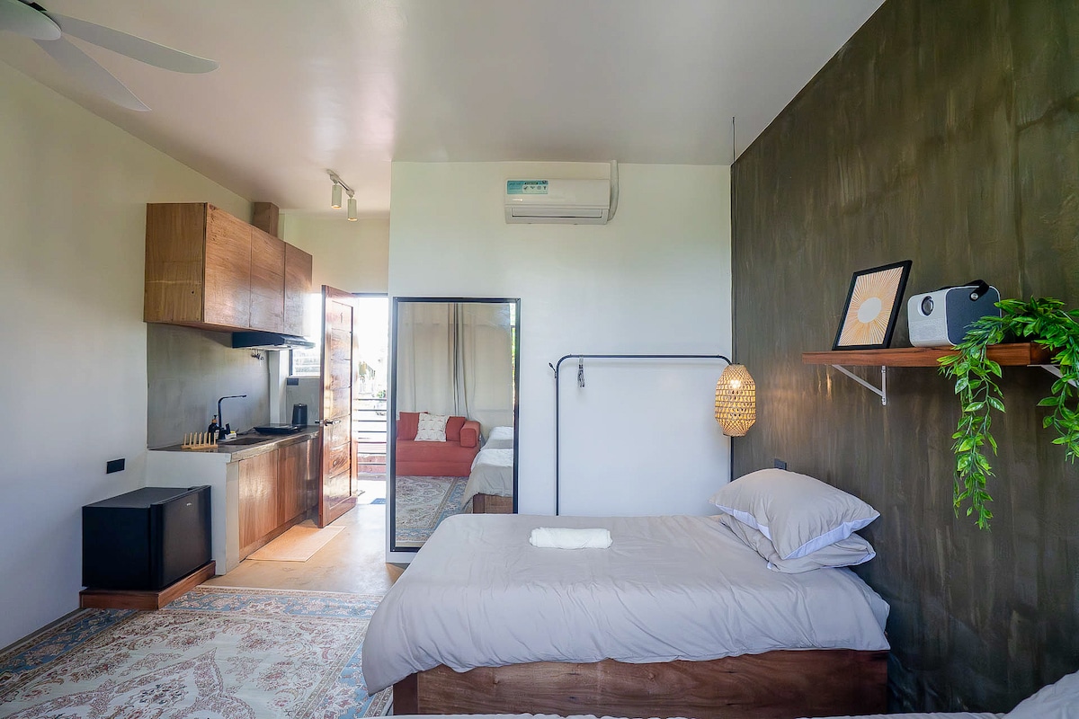 Strict quiet hours (9 PM–7 AM). Max one visitor. No balcony use during quiet hours. Located in a quiet part of downtown General Luna, away from bars yet walking distance to restaurants and essentials. Set in a gated, family and pet-friendly compound. Fully self-contained with private kitchenette, large fridge, cooking/dining essentials, storage, TV, hot shower, A/C, covered balcony/patio, and fast fiber internet. Ideal for peaceful stays, not late-night gatherings.