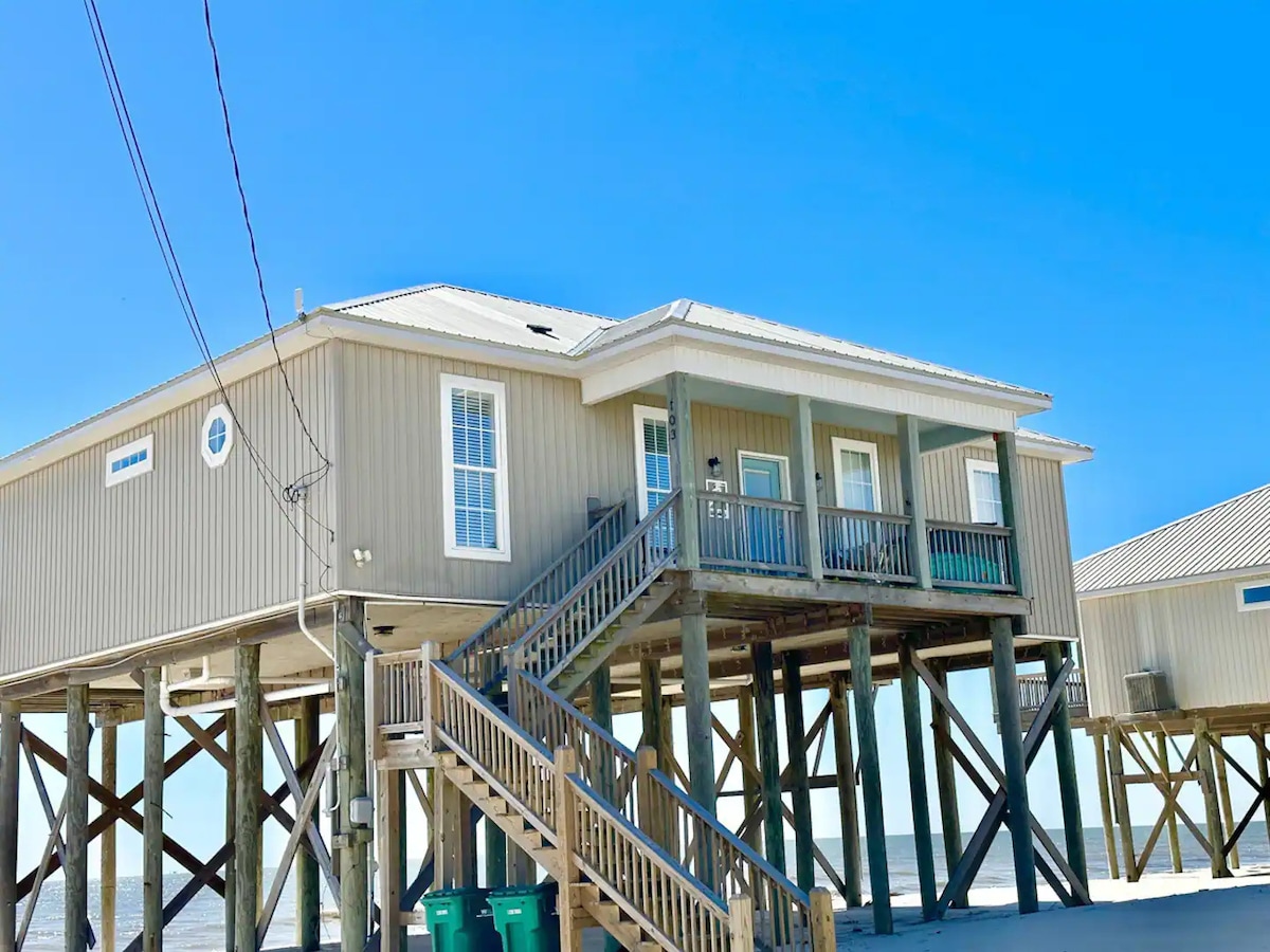 ¡El Flip Flop Beach Retreat es una encantadora casa de campo junto al mar ubicada en el corazón de la isla de Dauphin! Disfruta de tu propia playa privada y de hermosas vistas al estrecho de Mississippi. Tres dormitorios, loft y un fantástico porche cubierto que se presta a una relajación completa. La cocina totalmente equipada hace que comer en casa sea un placer. Esta casa tiene estacionamiento techado para 4 vehículos. Se admiten perros por una tarifa de 100 dólares por estancia. A solo unos pasos del agua y perfectamente preparado para tu bebé peludo. ¡Lista para tu escapada familiar!