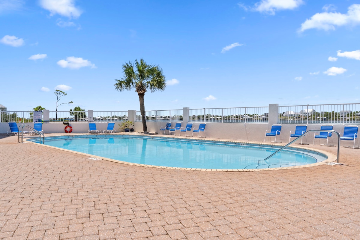 ¡Te encantará este espacioso apartamento de 3 dormitorios y 2 baños frente a la playa! Fácil acceso a playas de arena blanca como el azúcar, ¡a solo un corto paseo marítimo! ¡Te encantarán las hermosas vistas al mar y a la piscina desde el salón y el dormitorio principal! Ambas habitaciones tienen entradas con puertas corredizas de vidrio a tu balcón frente al golfo, equipado con una mesa de patio y sillas. Disfrutarás tomando un café por la mañana o una copa de vino al atardecer en el balcón mientras contemplas las hermosas vistas del golfo de México.