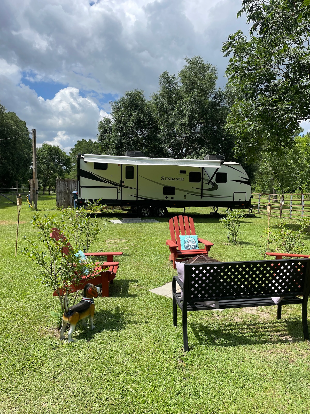 Nuestra caravana Heartland Sundance de 27 pies está preparada para los huéspedes en un pequeño terreno en la parte delantera de nuestra propiedad agrícola. Los huéspedes tendrán una gran vista de nuestros pastos con nuestro pequeño rebaño de vacas y caballos. Esta zona está preparada para una experiencia de glamping. Esto incluye un pozo para hacer fogatas, sillas y parrilla al aire libre. La caravana tiene 1 dormitorio principal, 2 literas individuales, la mesa y el sofá también se convierten en camas. Esta caravana es 1 de 2 caravanas ahora disponibles en nuestra granja.