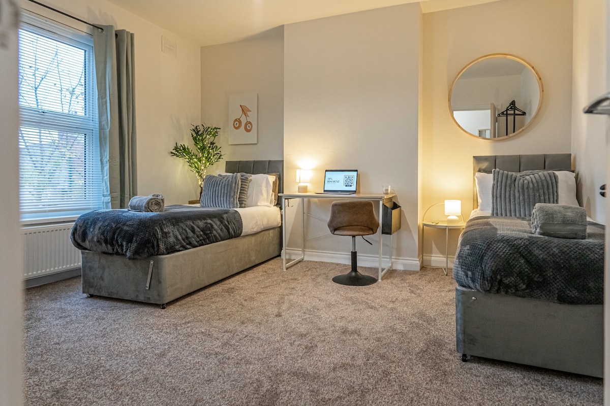 Luxury 2-bedroom apartment, ground floor, home feeling in the heart of Derby City Centre, quiet area, ensuring a relaxing stay. Perfect for business travellers, professionals, contractors, families and couples. - Elegant Design, open-plan - Smart TV, Netflix, Prime Vide, apps - Premium & luxurious beds, Sofa bed - Fully Equipped Kitchen & Contemporary Dining - Stylish Bathrooms - Laundry machine, pressing iron - Secured Building - FREE PARKING in front of the apartment! - Ground floor apartment