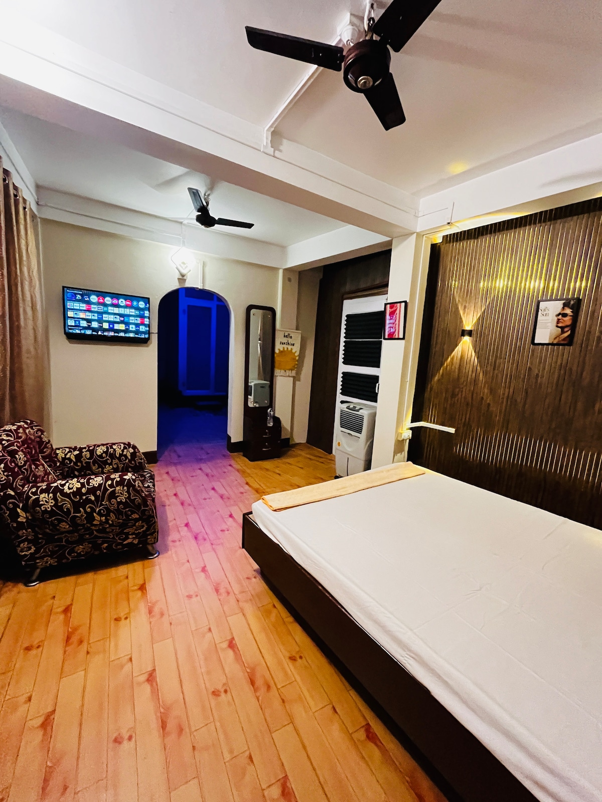 Experience a blend of comfort and convenience in our thoughtfully designed 1BHK AC unit. Located in the heart of Sivasagar, this suite is perfect for solo travelers, couples, or small families seeking a private, home-like atmosphere with modern amenities. Unit Highlights • Fully Air-Conditioned: Stay cool and comfortable regardless of the weather. • Spacious Bedroom: Features a cozy layout with contemporary decor and ambient profile lighting for a relaxing evening mood.