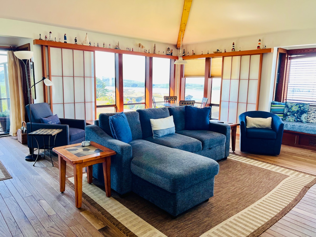 Welcome to "Wabi Tei" Beach House. Experience panoramic ocean views as you move about this spacious beach house at Dillon Beach. The upper main level has an open floor plan where the family room, dining room, newly remodeled kitchen, bonus room and balcony enjoy that “million dollar view” of Dillon Beach. We have 20 feet of window seating to lounge on while you enjoy expansive windows that look out onto the ocean waves or enjoy a movie on a flat screen TV.
