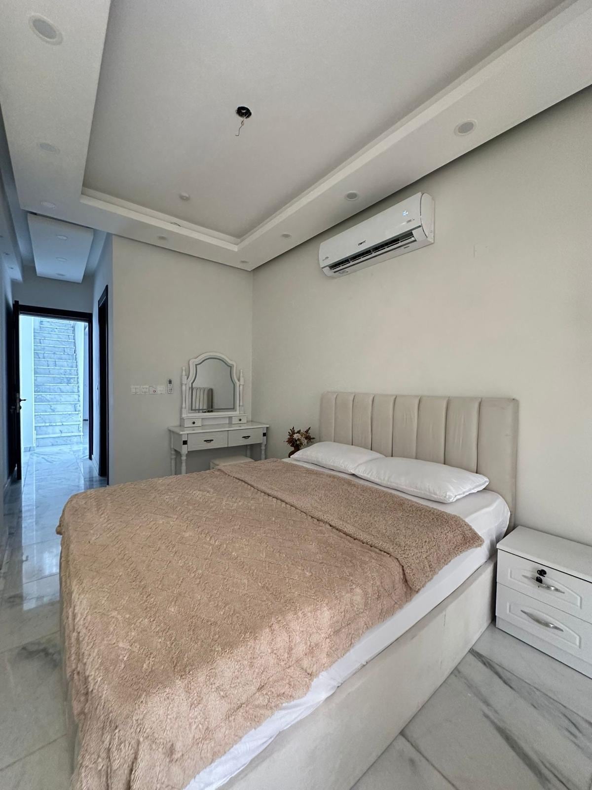 Forget your worries in this spacious and serene space consisting of 1 double bed and 2 single beds. inside the compound a super market ,laundry , bakery . Full air conditioning and 24/7 electricity