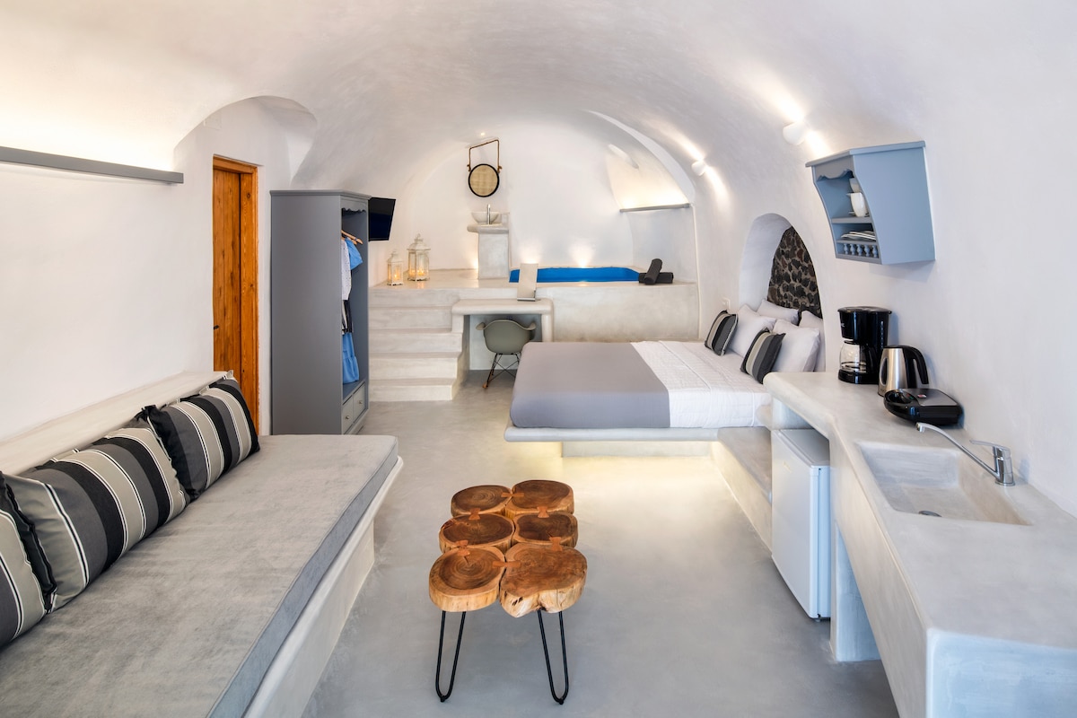 Antonio Caves son un ejemplo típico de la arquitectura de Santorini. Construidas en 1901, inicialmente se utilizaron como bodega de preparación de vinos y una panadería construida directamente en la roca volcánica. En 2020 fue renovado por completo y convertido en 3 suites autónomas que comparten un patio común. Situado en el tradicional pueblo de Megalochori, a dos minutos a pie de la pintoresca plaza del pueblo.