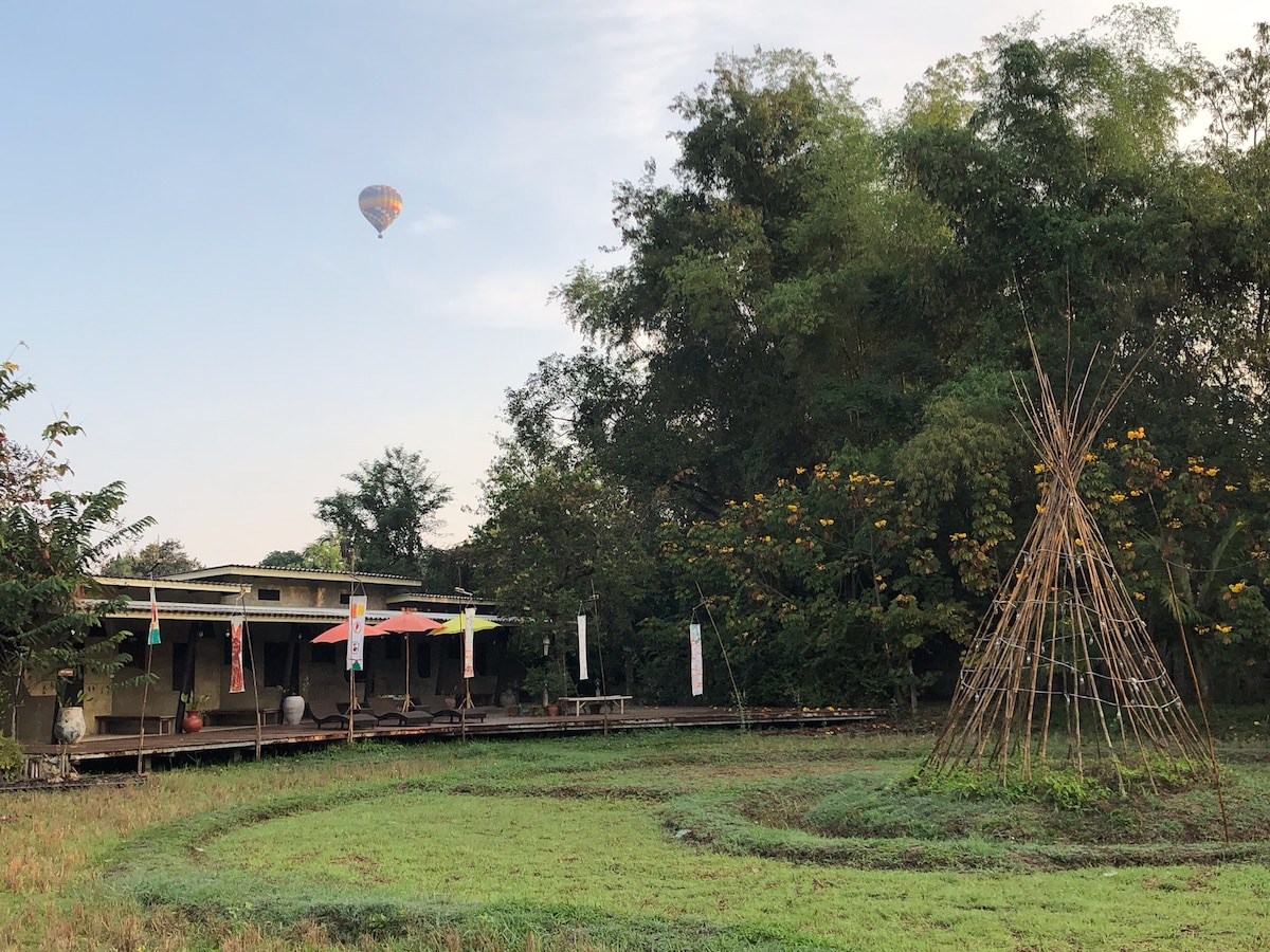 Relax in a peaceful wooden home surrounded by lime, jackfruit, starfruit, and mango trees, offering a true nature-filled escape. This cozy retreat overlooks the mountains and sits in a quiet, in San Sai, close to local markets, restaurants, and just 20 minutes from Central Festival Mall. Enjoy wide open green space, a bonfire area, and ample parking for cars and motorbikes. The property is pet-friendly, spacious, and perfect for guests looking for a calm, refreshing oasis away from the city.