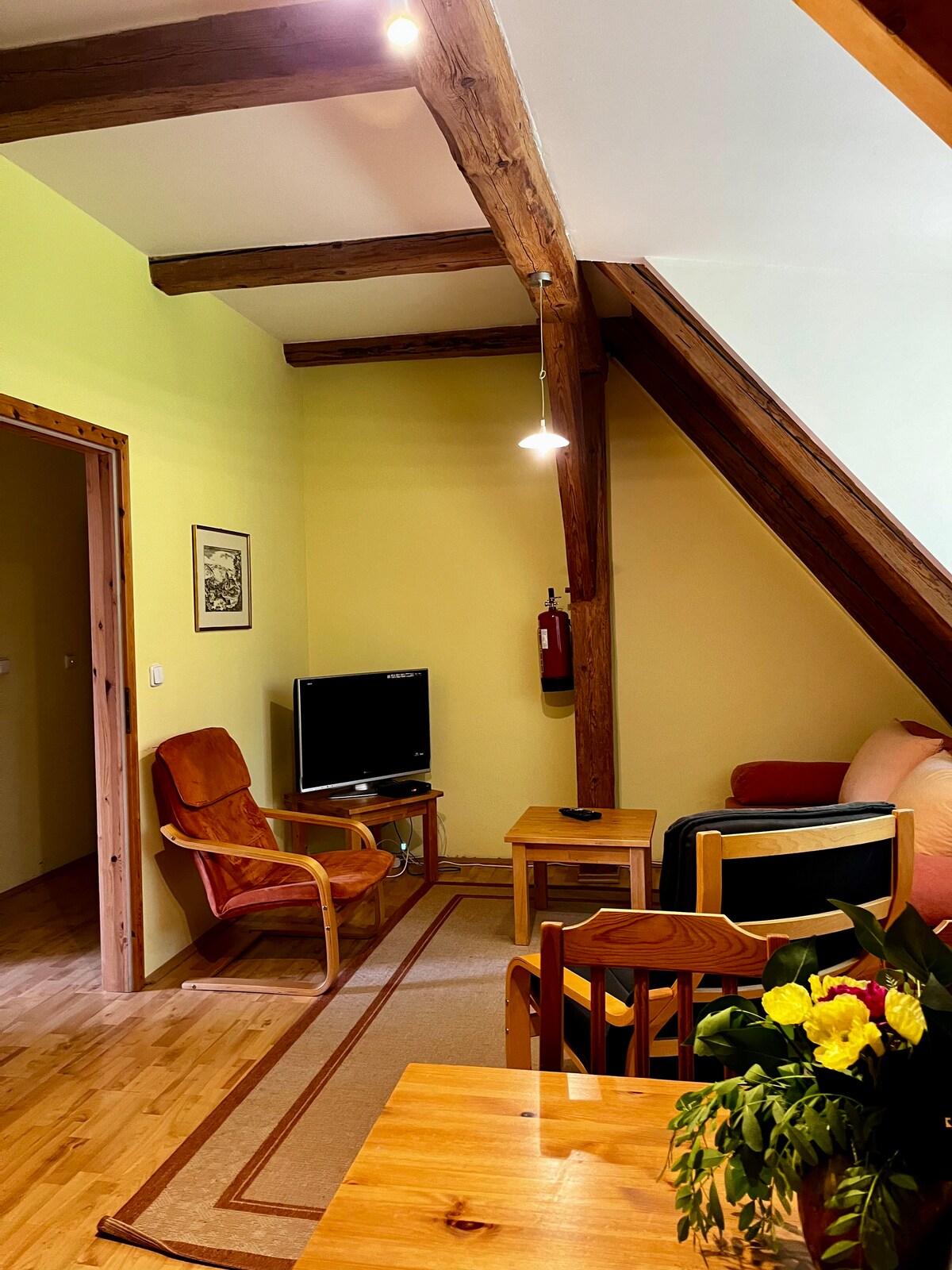 Apartamento independiente en una casa histórica: primer piso, acceso a través de un pasillo compartido; ventanas con vistas a la pintoresca plaza histórica y al castillo; baño espacioso y reformado con lavadora; dos dormitorios; cocina sencilla y antigua. Si se reserva para 1-2 persona(s), habitación n.º 1 disponible (con TV); si se reserva para 3-4 personas, 2 dormitorios disponibles (uno sin TV). Juego de asientos disponible para sentarse fuera de la casa en la plaza. El precio básico es para 1-2 personas, tarifa adicional a partir de la 3ª persona.