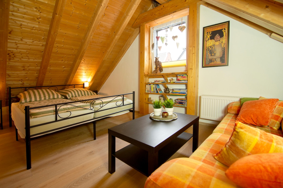 El apartamento consta de: dormitorio con una cama doble de 160 x 200 cm, sala de estar con un sofá cama que se puede extender hasta 160 x 200 cm, un cuarto de baño de 8 m² con bañera y ducha, así como una cocina de 9 m². El precio básico es para 2 huéspedes. Se incluyen sábanas y toallas, así como la limpieza de las instalaciones. Por cada persona adicional, hasta un máximo de 2, se añadirán 33 €. ¡No se admiten animales de asistencia!