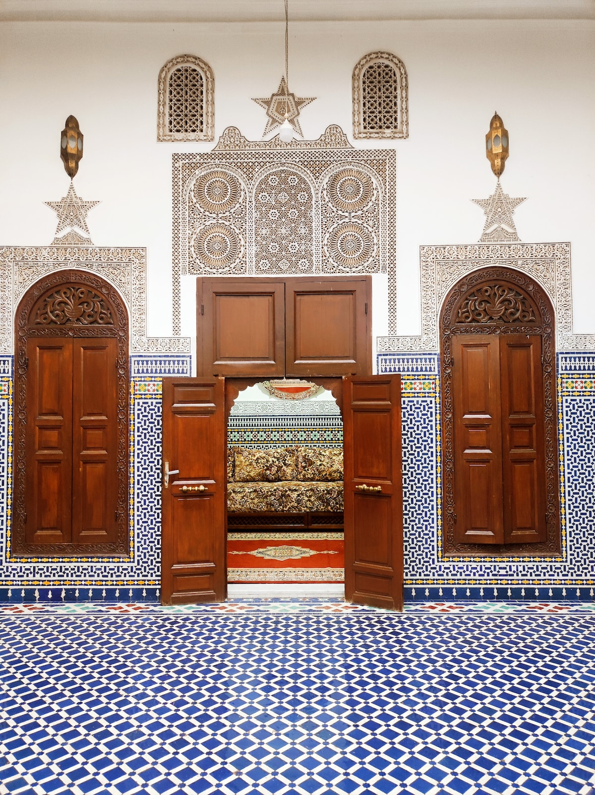Riad Tamo is a lovely 17th-century traditional house, located in the heart of the Medina (the old city of Fez). only 5 minutes walk from place Rcif, which is one of the main entrances of the Medina. The house was carefully restored by some of the best craftsmen of Fez, using traditional materials like plaster, mosaic, and natural cedar wood. It has a wonderful panoramic view to the south and east of Fez and is decorated with beautiful traditional furniture from Fez.