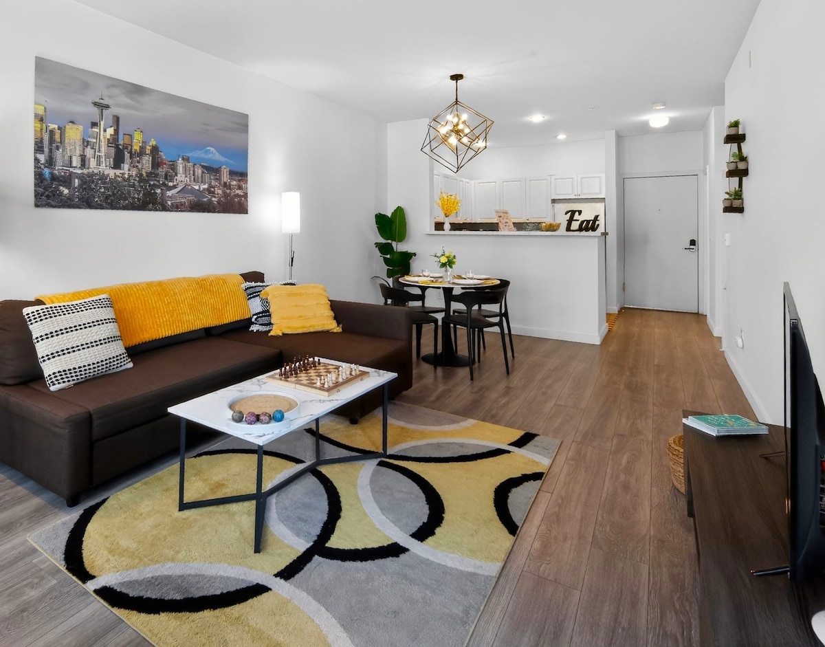 Enjoy a stylish experience at this centrally-located corner unit. 2BD 2BTH, can accommodate 7 guests. 1st bedroom- queen bed and work space desk. 2nd bedroom-queen bed and twin converter chair bed, and extra twin mat in closet. Living room- Pull out couch to queen bed. Keurig in unit. 9 min walk to Space Needle or Pikes Place. Shared 7th Floor Patio with BBQ, in common area over looking the water, large clubhouse and courtyard common area. Great dining experiences close by.