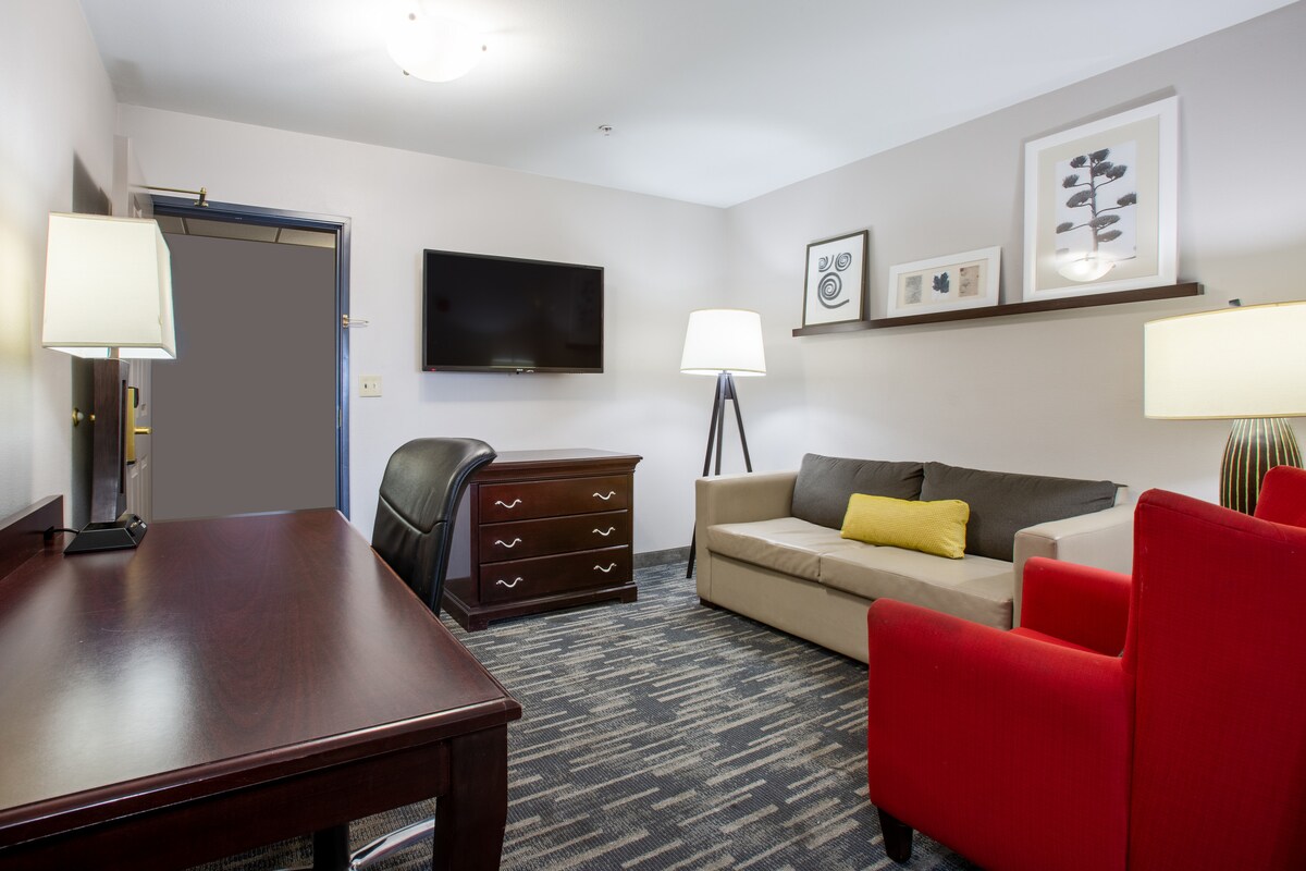 Acomódate y quédate un rato en esta habitación king limpia y económica, perfecta para equipos de trabajo, huéspedes a largo plazo o viajeros que pasan por Tucson. Convenientemente ubicada justo al lado de la I-10, nuestra propiedad hace que sea fácil moverse por la ciudad, ya sea que se dirija a sitios de trabajo, al centro de la ciudad o a restaurantes locales. Disfruta de una cómoda cama tamaño «king», wifi gratis, TV de pantalla plana y mininevera y microondas en la habitación: todo lo que necesitas para una estancia sencilla y sin estrés.