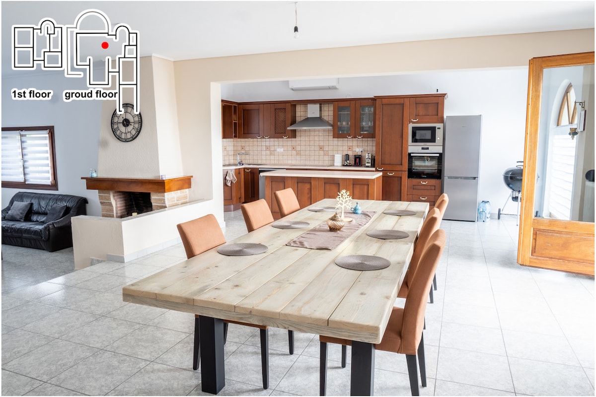 Enjoy the charm of Kavala from this stylish two-story maisonette, just 5 minutes from the beach and 15 minutes from the city center. With space for 8 guests, it features 4 queen-size bedrooms, a bright living area, and a large terrace with stunning skyline views. The fully equipped kitchen makes dining in easy, and fast WiFi keeps you connected. Located on the 2nd floor with no elevator, with a private garage for secure parking. Perfect for families or groups!