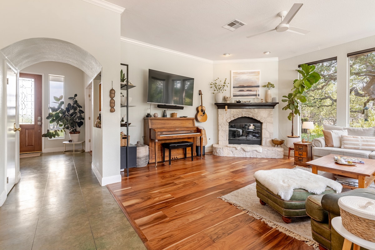 ¡La Casa Austin! Ubicada en 1,2 acres, camino privado con antiguos robles maduros, estrellas y una vista del atardecer desde una terraza en la azotea. La piscina está climatizada la mayor parte del año. (Sin diciembre, enero ni febrero) Con una privacidad increíble y vistas a Hill Country desde el lote en el cinturón verde. Se renovó toda la casa: pisos de vinilo de bajo voltaje (LVP), una cocina y electrodomésticos espectaculares, espacios acogedores y baños de lujo. ¡Ubicado cerca de lugares de Hill Country como Chapel Dulcinea, The Arlo, Salt Lick, viñedos, destilerías y mucho más!