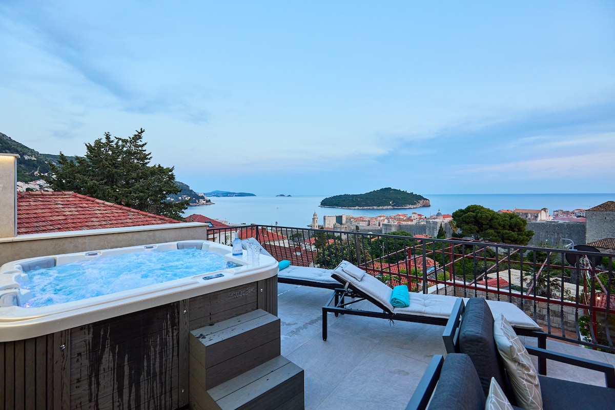 Con vistas al mar Adriático, la casa de dos dormitorios está a solo unos pasos del casco antiguo de Dubrovnik, la popular playa de Banje, el teleférico, tiendas y restaurantes que ofrecen impresionantes vistas a las murallas de la ciudad, fortificaciones, puente de piedra, puerto antiguo, paseo marítimo e isla de Lokrum. Con más de 250 días de sol al año y un impresionante entorno en el mar Adriático, Dubrovnik es un destino de primera para cualquier persona a la que le guste ver el sol caer por debajo del horizonte en medio de un juego meditativo de naranjas y magentas.