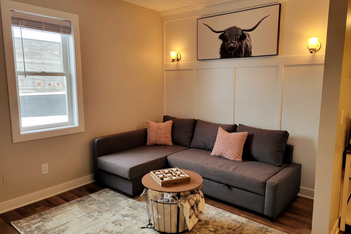 Hemos diseñado un acogedor y moderno espacio escandinavo de dos dormitorios para tu comodidad y disfrute. Este elegante y moderno espacio de estar tiene un ambiente urbano y todas las comodidades, así como los servicios que necesitas para disfrutar de una estancia fantástica. Se encuentra en una de las calles más bonitas e históricas de Northfield y a pocos pasos del hermoso campus de St. Olaf College. Este espacio también puede estar disponible como un dormitorio por un precio más bajo. Busca «Scandinavian Design Suite - One Bedroom»