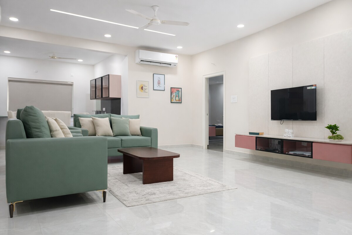 Luxury Banjara Hills Retreat Hyderabad's finest. A 5-star alternative in the most prestigious neighborhood. Accommodation: King Master Suite (designer decor, LED light, blackout). Bathrooms: Two luxury baths with rain showers/glass enclosures. 3 in Total Kitchen: Fully equipped; includes washing machine. Features: Full A/C, marble floors. Proximity: Steps from high-end dining, shopping, and business centers.