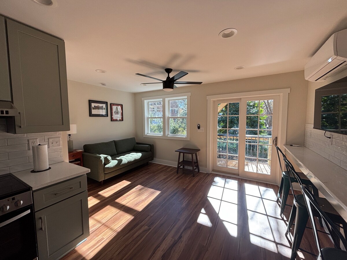 Este apartamento de nueva construcción, que funciona con energía solar, se encuentra en una calle tranquila en Trinity Park.Es el primer piso de una unidad de 2 pisos ubicada detrás de mi casa de 1939 y tiene 420 pies cuadrados.El apartamento de 1 dormitorio cuenta con una cama tamaño queen, sala de estar abierta con cocina completa y barra para comer/trabajar, baño completo y terraza privada.Conveniente para la I-85 y a solo 0,5 millas a pie del Campus Este de Duke, 0,8 millas hasta Ninth St y 1,5 millas hasta el centro de la ciudad y las estaciones de tren/autobús a través de calles arboladas o Ellerbee Creek Trail.