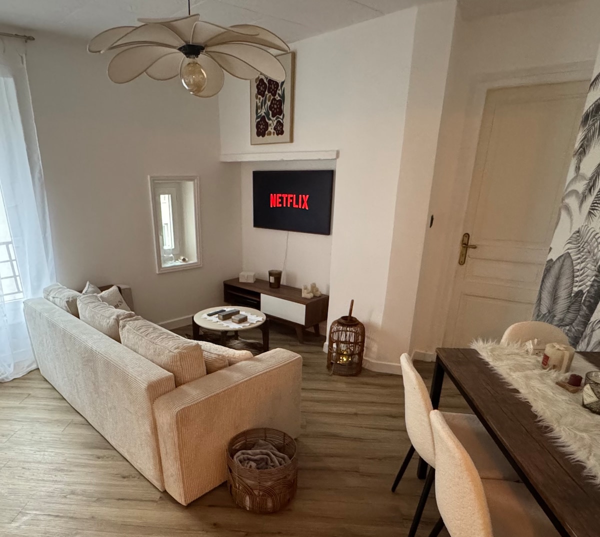 Véritable 2 pièces entièrement rénové. L’appartement lumineux de 38m2, accessible par un escalier d’une quinzaine de marches, se compose d’une cuisine entièrement équipée ouverte sur le salon et le coin repas. Le salon dispose d’un téléviseur. Le logement dispose d’une véritable chambre à part (matelas Queen size 160x200) avec sa petite penderie. Salle de bain avec douche et miroir éclairant + chauffage électrique. Toilettes séparées.