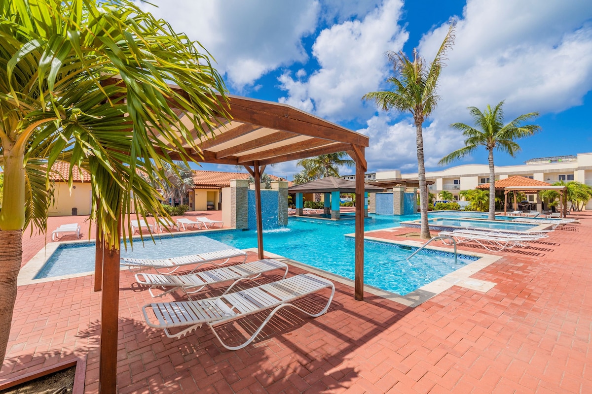 ¡Relájate y desconecta en este alojamiento tranquilo y elegante que está a tiro de piedra de Eagle Beach! ¡Incluso tenemos un carrito para que puedas llevar tu nevera llena de delicias, tumbonas, toallas de playa e ir a disfrutar de un maravilloso día en la playa! ¡La hora feliz en el bar de la playa es imprescindible! ¡Relájate en casa junto a la piscina rodeada de un hermoso oasis tropical! También hay un gimnasio, barbacoa y comedor al aire libre. Personalmente, ¡disfrutar de la cálida brisa caribeña en los sofás al aire libre es nuestro favorito!