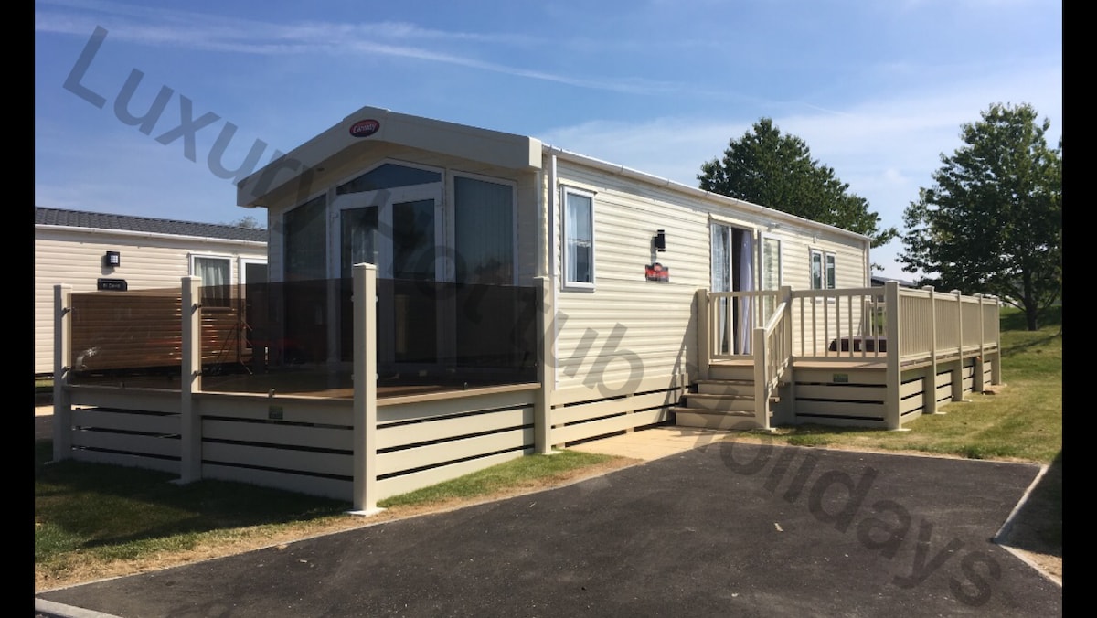The holiday home is situated on a quieter area of the park, on a no through road so there is very little passing traffic. Although it is not actually lakeside,It has decking to the front with seating, which overlooks waterski lake. To the side is another decked area with rattan furniture and 6 seater private hot tub.