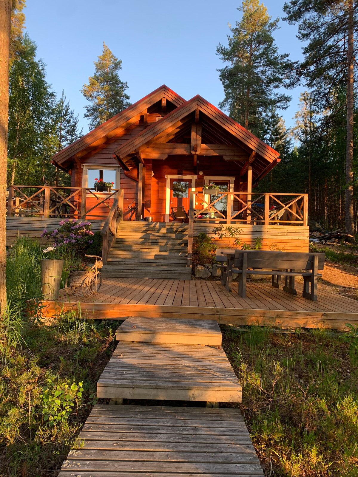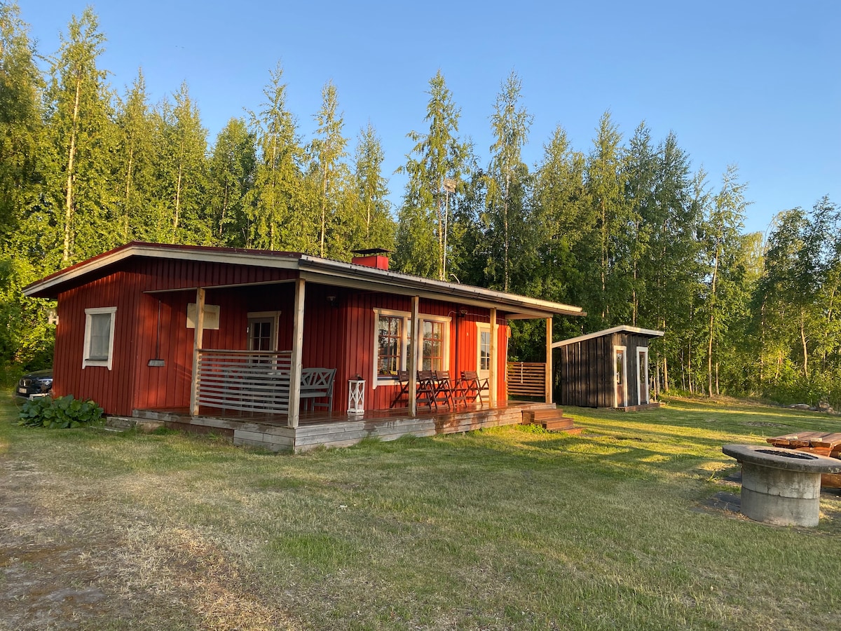 Laponia está llena, ¡ven a Kainuu! En una parcela soleada y boscosa en Kajaani, una acogedora cabaña para 6 personas con una maravillosa sauna de playa calentada con leña. El sol brilla en la playa de la cabaña hasta bien entrada la noche. La sauna de la playa está situada justo al lado del agua y la propia cabaña está un poco más arriba en la parcela. Dentro de la cabaña hay agua corriente, un inodoro y una ducha que aportan un poco de lujo a la estancia. La cabaña está equipada con una gran terraza cubierta, con vistas a través del bosque hasta el lago.