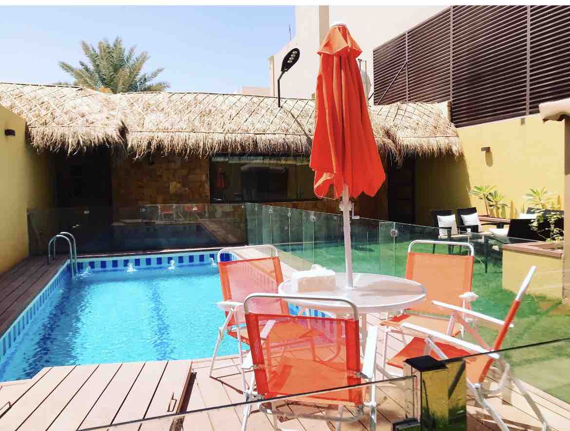 Alquila un chalet de lujo en Al Ramal Disfruta de un ambiente único en un elegante chalet que te ofrece privacidad y comodidad, perfecto para familias y reuniones. Características: Salón para 9 personas. Auriculares y wifi Mini mesa para comer Piscina privada Sesiones al aire libre Dormitorios acogedores. Cocina equipada Estacionamiento privado.