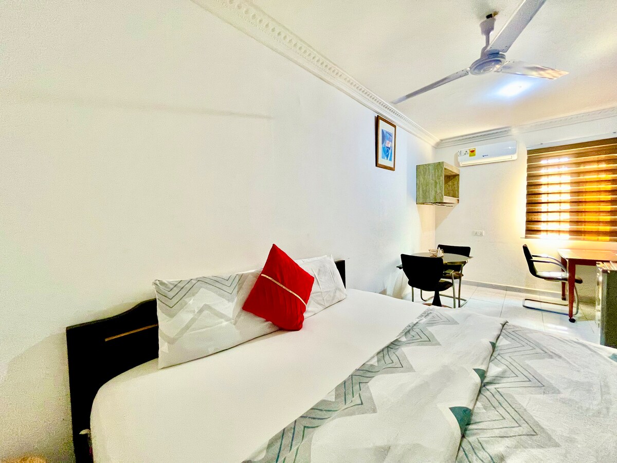 La habitación estándar se caracteriza por la elegancia. Un alojamiento más sensacional para un máximo de 2 personas. Cuenta con una cama doble con colchón de alta calidad para un sueño reparador y una cocina pequeña totalmente amueblada con utensilios de cocina. Ofrece a los viajeros una relajación pura y está cuidadosamente diseñado para garantizar una estancia agradable. Son ideales para una escapada larga o corta o para viajes de negocios. Los huéspedes también pueden contemplar el tranquilo entorno desde su balcón para disfrutar de la máxima sensación relajante.