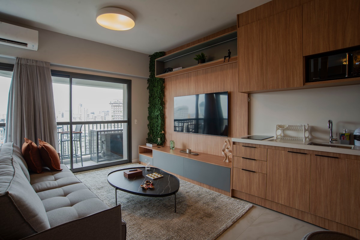 Descubra One Eleven en Vila Olímpia. Este departamento moderno cuenta con grandes ventanales con impresionantes vistas a la ciudad y luz natural. La unidad cuenta con Internet de 600 Mbps y un televisor 4K HD. Para una comodidad total, cuenta con un sistema de aire acondicionado frío/calor: una unidad de 27 000 BTU/h en la sala de estar y otra de 10 000 BTU/h en el dormitorio. El dormitorio es silencioso y oscuro para disfrutar de un sueño reparador. Con un mantenimiento impecable, estará a poca distancia a pie de los mejores restaurantes y centros de negocios: un refugio seguro y de primer nivel con un impresionante telón de fondo urbano.