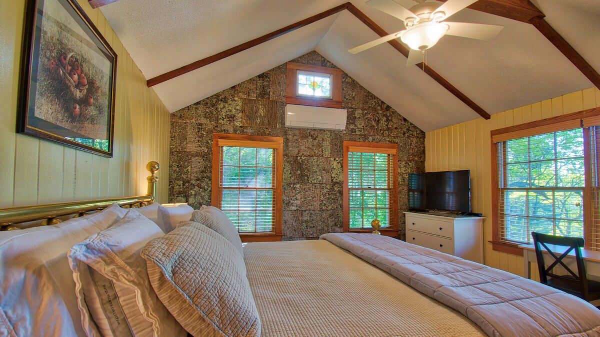 Beautiful setting overlooking Hendersonville Country Club just minutes from Historic Downtown and all our mountain community has to offer. You will enjoy the oversized bedroom with King-sized brass bed and desk, sofa and TV. Catch up on media with high-speed Internet or stream on Smart TV. Get ready for the day in the refurbished bathroom with walk-in shower. You will be away from it all but in the middle of everything, enjoying the ambience of this 1940's mountain retreat.