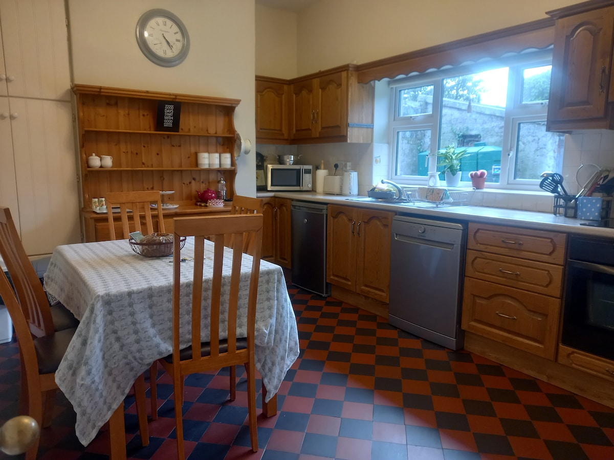 Conveniently located in the quaint and historic village of Corofin, Co Clare. Spacious two-story family home. Accommodates six people comfortably. 3 en-suite bedrooms and ½ bath on the first floor. Access to broadband and Tv there is ample connectivity for everyone to relax. Split level kitchen & living room with tv. Separate spacious sitting room with solid fuel stove. Close to pubs live music, local grocery shops, off-license. Close to the tourist info centre.