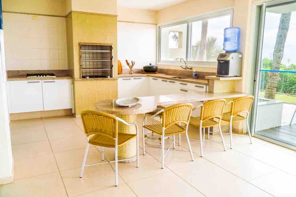Casa frente al mar con 5 suites, sala de estar/comedor con chimenea, cocina y barbacoa integradas a la sala con vista frontal al mar, baño, lavandería y dep. de empleada. Salas y suites con aire acondicionado. La casa tiene wifi y está bien equipada. Cuenta con una terraza de madera con mesa, sillas y tumbonas a 10 metros de la playa. Ubicación privilegiada, en medio del condominio frente al acceso privado a la playa y también frente a la piscina. Se encuentra en un condominio cerrado pequeño y tranquilo.