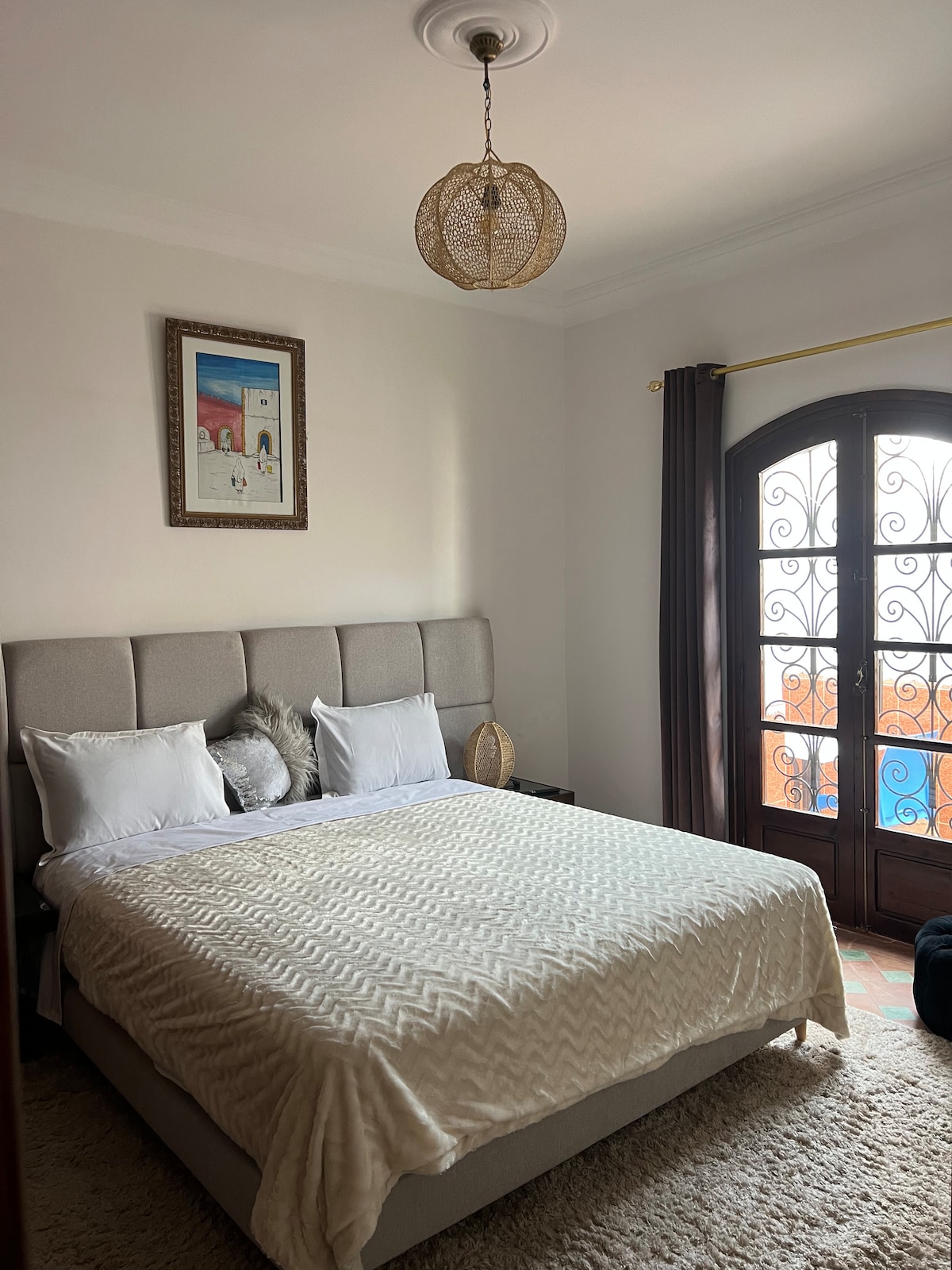 Appartement lumineux et raffiné de 100 m², subtilement décoré dans un esprit marocain élégant, mobilier sur-mesure et finitions soignées. Il offre 2 chambres pleines de charme, un salon spacieux avec cheminée et coin repas, une cuisine ouverte toute équipée, une grande salle de bain et deux balcons baignés de soleil. Parfait pour un séjour à deux, en famille, entre amis. Nichée dans un quartier authentique et vivant, à deux pas des commerces, à 10 minutes de la plage et 20 min de la Médina.