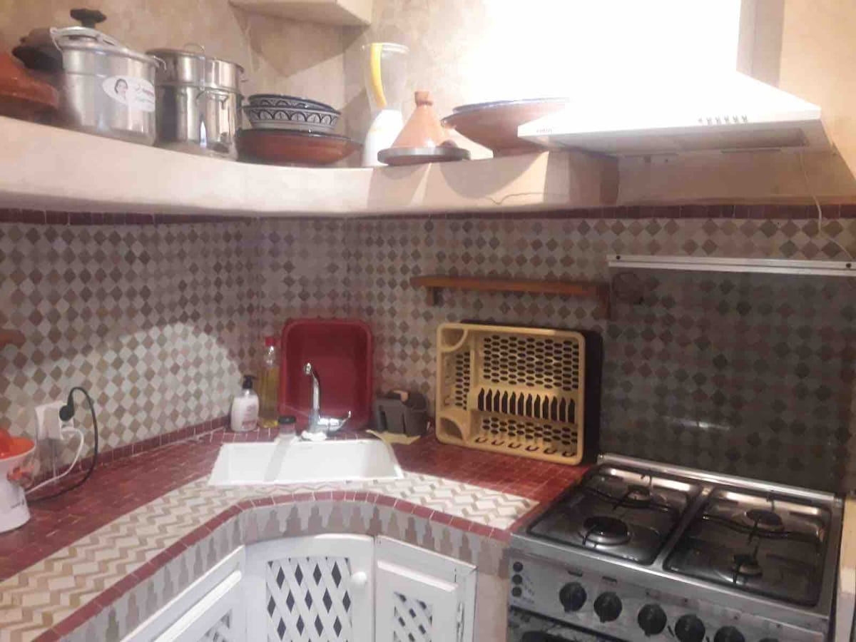 Bienvenido a nuestro riad muy grande, luminoso, fresco y cómodo. Estamos en un pequeño callejón que conduce desde la calle comercial turística principal, por lo que no te perderás. A pocos minutos hay tiendas, cafeterías y restaurantes encantadores. Hay dos dormitorios dobles y dos dormitorios en la terraza soleada con camas individuales. Uno se puede convertir en doble. Hay dos plantas principales con muchos espacios de trabajo, dos terrazas soleadas y un baño con ducha en cada planta. Tenemos wifi de fibra óptica rápida y la cocina está totalmente equipada.