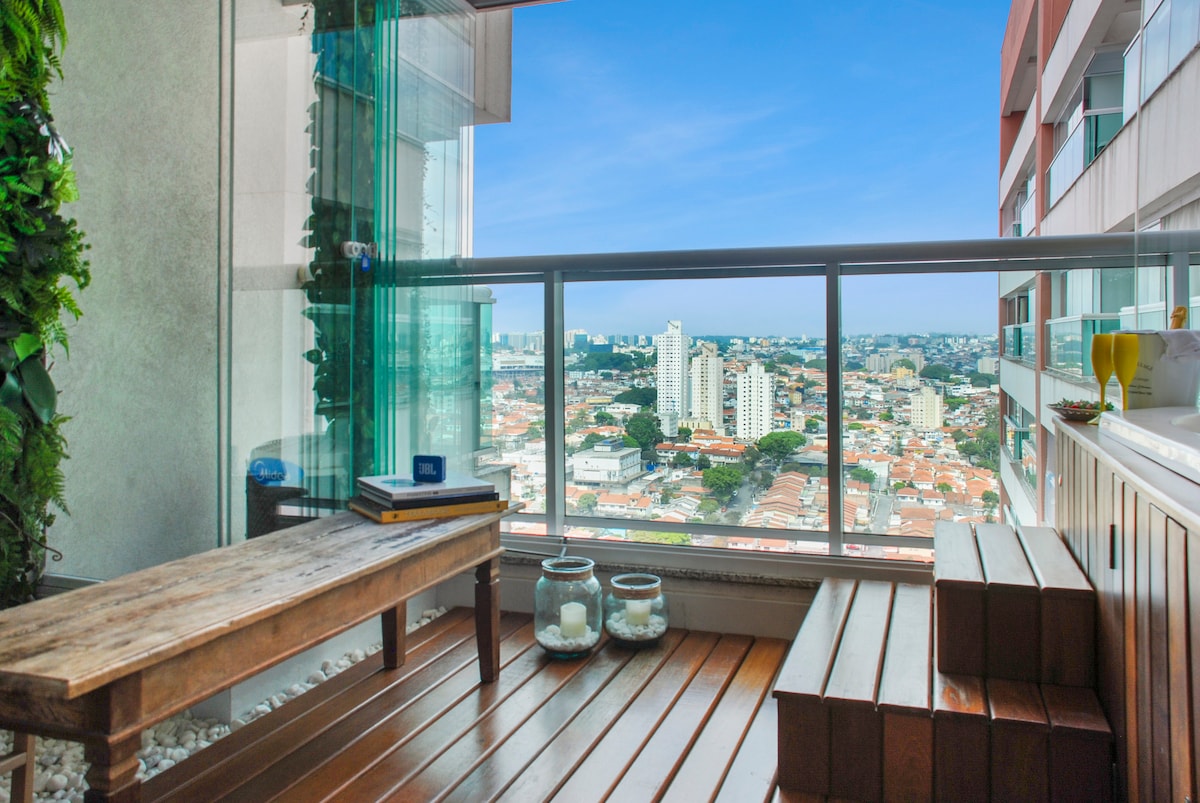 Loft nuevo, decorado con encanto y elegancia en Perdizes, a 300 metros del centro comercial Bourbon. Todo equipado con Jardín Vertical, Cama Queen Size, Minibar, Wi-Fi, Oficina con Internet por Cable, Smart TV 4K HDR 50 Pulgadas, Microondas